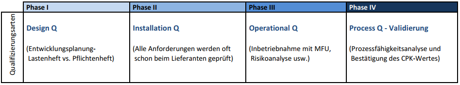 Mit der Sorgfalt der richtigen Entscheidungsprozesse (Pugh Matrix,..) endet die Phase I. In der Phase II werden alle Anforderungen aus der Phase I auf Erfüllung geprüft. Bereits bei den Lieferanten liegt enormes Fehlerpotenzial, welches im Vorwege geklärt werden kann. In der Phase III wird die neue Anlage gemäß ihrer geforderten Fähigkeit an Ihrem zukünftigen Platz abgenommen (MFU). Zu diesem Zeitpunkt erfolgt auch die Gefährdungsbeurteilung, sodass die Anforderungen der Arbeitssicherheit bestätigt werden können. Abschließend werden in der Phase IV, unter Einbindung alle weiteren Einflussfaktoren, die Prozessfähigkeitsuntersuchung (PFU) durchgeführt. Letztlich hier, erst am Ende der vollständigen Qualifizierungsphasen, zeigt sich, ob der Prozess als „beherrscht“ gilt.